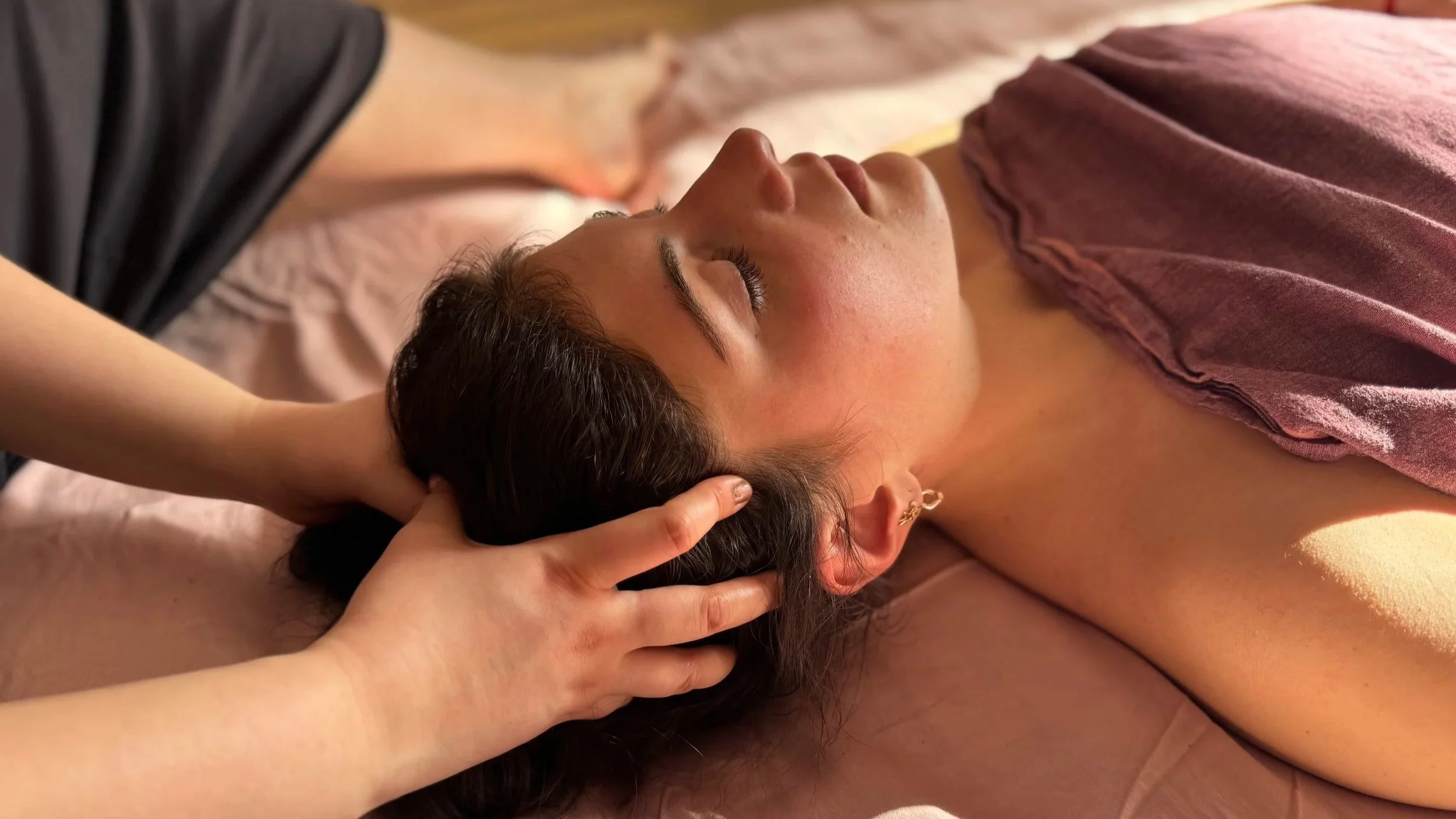 Clients are invited to switch off, close their eyes, and allow their body to be deeply relaxed and heavy